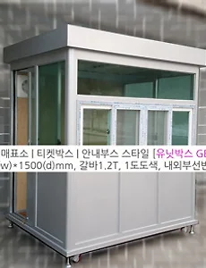 안녕하십니까? 티켓박스, 조작실, 경비실, 주차안내실, 흡연부스, 대기부스, 안심부스 등을 제작하여 소개하는 (스페이스플랜)입니다. 야외 수영장 / 놀이시설 / 공연장 등의 이용객들의 티켓판매를 위한 공간으로 꾸준히 인기 있는 1인매표소 (스페이스플랜 SP_642)를 제작 해 보았습니다. 매표소 매표소 spaceplan.co.kr )> (스페이스플랜 SP_642) 제품사양 1. 재질 : 갈바 1.2T 철재질 2. 사이즈 : 1,200(길이)*1200(폭)*2,400(높이)mm 3. 색상 : 1도 검정색도장 4. 선반시설 : 내부선반(1), 외부선반(1) / 고정식 5. 전기시설 : 분전함, 콘센트, 인터넷선 6. 조명시설 : LED조명등(1), 스위치 7. 창문 : 알루미늄샤시(1), 고정식창 / 5T일..