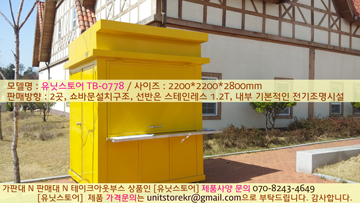 먼저 [유닛스토어 TB-0778]은 판매방향이 2곳이며, 간판이 3면에 설치할 수 있어 놀이공원같은 테마파크나 대형마트, 아울렛과 같은 곳에 테이크아웃존에 설치되고 있는 스타일입니다.