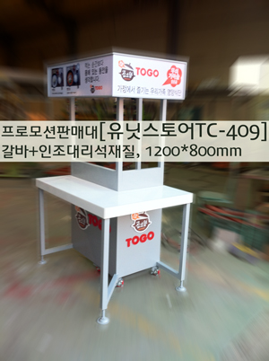 [유닛스토어 TC-409]모델은 기본적으로 갈바재질로 만들어 함마톤 분체도장을 하였으며, 선반 상판을 인조대리석을 올렸으며, 사인물을 시트지이외에 아크릴스카시 등을 효과를 주어 고급스럽운 프로모션 매대스타일입니다.