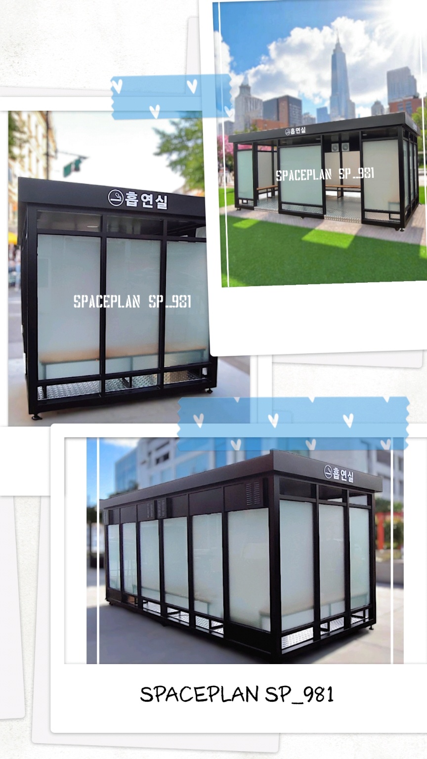 안녕하십니까? 야외 흡연실이나 휴게부스, 근로자 대기실, 쉼터부스 등을 제작하는 (스페이스플랜)입니다. 공공장소에서의 비흡연자들이 간전흡연의 피해를 줄이고, 담배꽁초를 아무곳에난